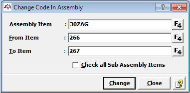 - Click "Utilities" from menu-bar & select Update Bulk Entries > Change Code In Assembly Item and following window will appear.