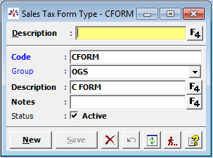- Here user can define various type of Sales Tax forms. For e.g.: C Form etc.