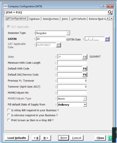 - A multiple tab window "Company Configuration" will open as below showing "GST Configuration" by default.