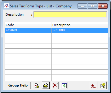 3. Press F4 on 'Description' and screen "Sales Tax Form Type" will appear as shown below.